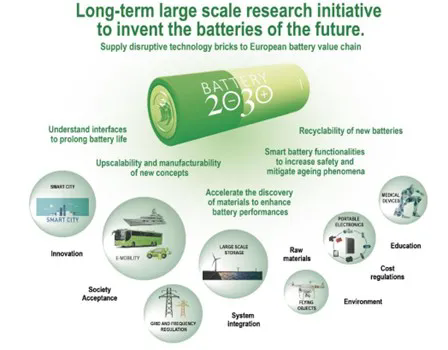 Part I:“電池2030+(BATTERY 2030+)”背景《電池2030+(BATTERY2030+)》是一項(xiàng)大規(guī)模的歐洲長期研究計(jì)劃,為歐盟委員會提出的戰(zhàn)略能源技術(shù)計(jì)劃(SET-plan)的想法之一,旨在聯(lián)合歐洲整體解決未來電池研發(fā)過程中所面臨的各項(xiàng)挑戰(zhàn),克服重重阻力達(dá)成宏大的既定的電池性能目標(biāo)。研究內(nèi)容以“化學(xué)中性途徑(chemistry neutral approach)”為導(dǎo)向,基于現(xiàn)有或未來多種不同類型的電池化學(xué)物質(zhì),通過縮小各自之間的差距來發(fā)揮其全部潛力以實(shí)現(xiàn)電池的實(shí)際能力和理論極限。理念上基于給歐洲電池企業(yè)乃至全球電池企業(yè)的價(jià)值鏈提供新的發(fā)展和支持,比如從原材料到先進(jìn)材料的發(fā)展,到電池和電池包的設(shè)計(jì)制造,電池壽命終止后的回收利用和電池實(shí)際應(yīng)用場景等。除此之外,《電池2030+》的長期發(fā)展路線圖也充分地彌補(bǔ)了歐洲電池內(nèi)部的中期研究和創(chuàng)新工作–歐洲技術(shù)和創(chuàng)新平臺(ETIP)。因此,歐盟希望借助于《電池2030+》來推動歐洲為期10年的大規(guī)模努力以促進(jìn)電池領(lǐng)域的變革性發(fā)展。不斷提出新的研究方法和開拓新的創(chuàng)新領(lǐng)域,實(shí)現(xiàn)安全的超高性能電池開發(fā),最終實(shí)現(xiàn)歐洲社會2050年前不再使用化石能源(如圖1所示)。2019年3月,歐盟啟動《電池2030+》協(xié)調(diào)和支持行動,以確定計(jì)劃的研發(fā)路線圖。本次發(fā)布的《電池2030+》研發(fā)路線圖第二版草案經(jīng)討論修改后,將于2020年2月底提交給歐盟委員會。 圖1. 《電池2030+》的長期愿景及使命 Part II:“電池2030+”計(jì)劃目標(biāo)《電池2030+》的總體目標(biāo)是實(shí)現(xiàn)具有超高性能和智能化的可持續(xù)電池功能以適用于每個應(yīng)用場景。所謂超高性能,是指能量和功率密度接近理論極限,出色的使用壽命和可靠性,增強(qiáng)安全性,環(huán)境可持續(xù)性和可擴(kuò)展性,以實(shí)現(xiàn)具有競爭力成本的大規(guī)模化生產(chǎn)電池。第一個重要挑戰(zhàn)是達(dá)到最 好的電池性能,因此發(fā)現(xiàn)新材料和新化學(xué)體系的開發(fā)過程必須加快。《電池2030+》提出電池界面基因組(BIG)–材料加速平臺(MAP)計(jì)劃,將采用人工智能(AI)大幅減少電池材料的開發(fā)周期。第二個重要挑戰(zhàn)是延長單體電池和電池系統(tǒng)的使用壽命和安全性。壽命和安全都對未來電池的大小,成本和接受度具有關(guān)鍵性影響。為了實(shí)現(xiàn)第二個挑戰(zhàn),《電池2030+》提出了兩種不同且互補(bǔ)的建議方案:開發(fā)直接在化學(xué)和電化學(xué)反應(yīng)中可探測的傳感器,將新型傳感器嵌入電池中連續(xù)監(jiān)控其“健康”和“安全狀態(tài)”。另一方面,通過使用自愈合功能來提高電池容量并提高電池性能。與目前最 先進(jìn)的電池技術(shù)相比,《電池2030+》旨在提出并影響電池技術(shù)的未來發(fā)展(如圖2):第一,將電池實(shí)際性能(能量密度和功率密度)和理論性能之間的差距減少至少1/2。第二,至少將電池的耐用性和可靠性提高3倍。第三,對于給定的電力組合,將電池的生命周期碳足跡減少至少1/5。第四,使電池的回收率達(dá)到至少75%,并實(shí)現(xiàn)關(guān)鍵的原材料回收率接近100%。 圖2.《電池2030+》對未來電化學(xué)存儲系統(tǒng)的最 新技術(shù)展望 Part III:“電池2030+”主要研發(fā)方向3.1 材料加速平臺(Materials Acceleration Platform,MAP)從能源技術(shù)的生產(chǎn),存儲到最終交付使用,材料的發(fā)現(xiàn)和開發(fā)始終貫穿于整個過程。特別對于新興的電池技術(shù),先進(jìn)材料幾乎是所有清潔能源創(chuàng)新的基礎(chǔ)。若依靠現(xiàn)有的傳統(tǒng)重復(fù)性試驗(yàn)開發(fā)過程,需要耗費(fèi)大量的時(shí)間,人力物力去開發(fā)新型高性能電池材料并用于電池設(shè)計(jì),這一過程從最初發(fā)現(xiàn)到完全實(shí)現(xiàn)商業(yè)化可能長達(dá)10年之久。因此,在《電池2030+》項(xiàng)目中,為了加速超高性能的,可持續(xù)發(fā)展的智能型電池開發(fā),計(jì)劃在歐洲范圍內(nèi)設(shè)立電池“材料加速平臺(MAP)”,并與電池界面基因組(BatteryInterface Genome,BIG)集成在一起。同時(shí)BIG-MAP基礎(chǔ)設(shè)施模塊化設(shè)置,全系統(tǒng)具有高度的通用性,以便能夠容納所有新興的電池化學(xué)體系,材料成分,結(jié)構(gòu)和界面。另一方面,MAP將利用人工智能(AI)從許多互補(bǔ)的方法和技術(shù)中集成和編排數(shù)據(jù),整合計(jì)算材料設(shè)計(jì),模塊化和自主性綜合機(jī)器人技術(shù)和先進(jìn)表征,實(shí)現(xiàn)全新的電池開發(fā)策略。促進(jìn)材料,工藝和設(shè)備的逆向設(shè)計(jì)和定制。最終,在MAP框架下由每個核心元素構(gòu)建概念電池,開發(fā)出具有突破性的電池材料,極大提高電池開發(fā)速度和電池性能。圖3. 電池材料加速平臺(MAP)的核心組成部分 (一)MAP重點(diǎn)研發(fā)技術(shù)a. 高通量技術(shù):開發(fā)自主材料合成機(jī)器人,構(gòu)建電池材料自身及使用過程中原位的自動化高通量表征。實(shí)現(xiàn)電極活性材料及其組合方式的快速篩選和電解液配方的系統(tǒng)表征。基于高通量數(sh